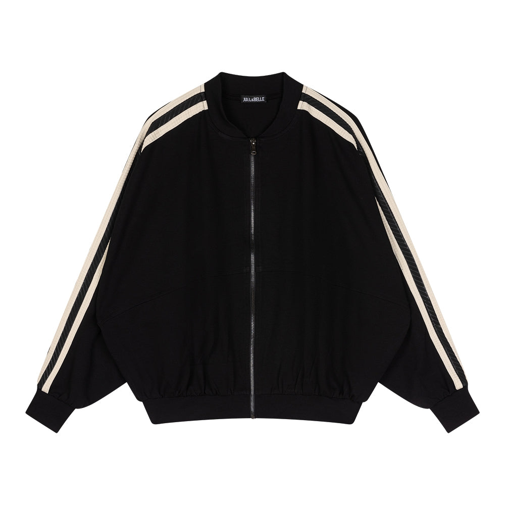 Dit zwarte sportieve jasje is uitgevoerd in een ruimvallend model met een trendy oversized fit. De contrasterende bies op de arm geeft een dynamische uitstraling, terwijl de doorlopende rits zorgt voor optimaal gemak.Gemaakt van een hoogwaardige mix van 65% viscose, 30% nylon en 5% elastaan: een combinatie die zacht aanvoelt, soepel meebeweegt en comfortabel is om de hele dag te dragen. Ideaal voor een sportieve én stijlvolle look, of je nu casual de deur uit gaat of een urban outfit samenstelt.