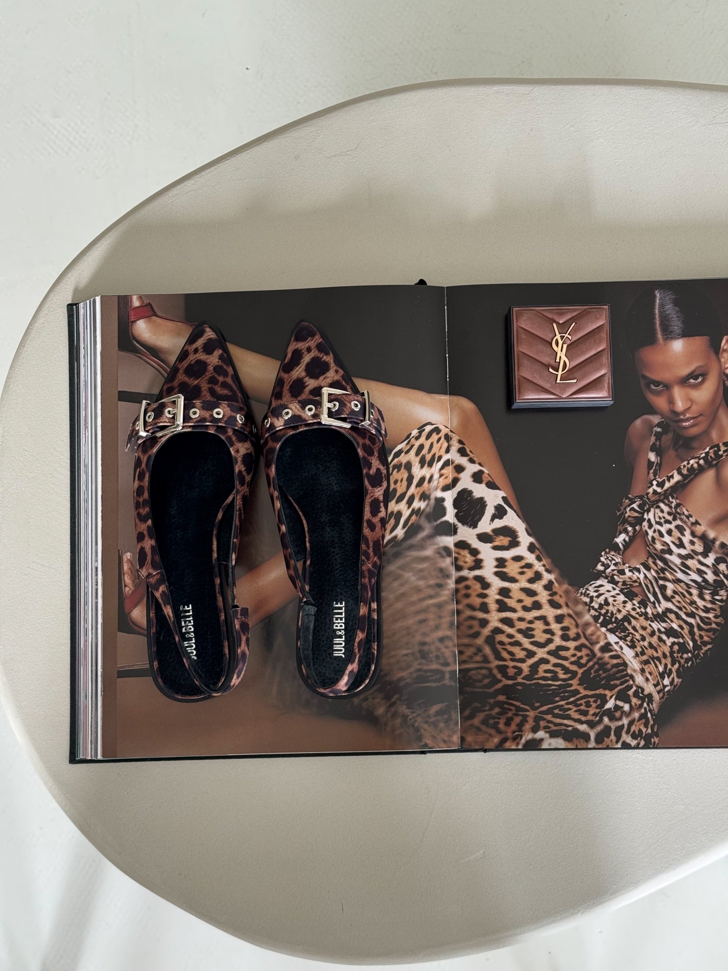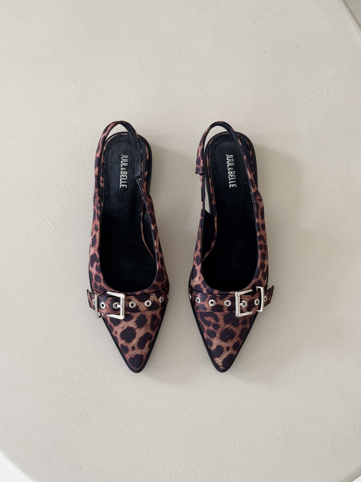 This elegant slingback shoe with a stylish leopard print adds a touch of sophistication to any outfit. Featuring a pointed toe and chic metal buckle, it combines timeless design with modern flair. The low heel and open back make it comfortable and breathable — ideal for everyday wear or a night out.