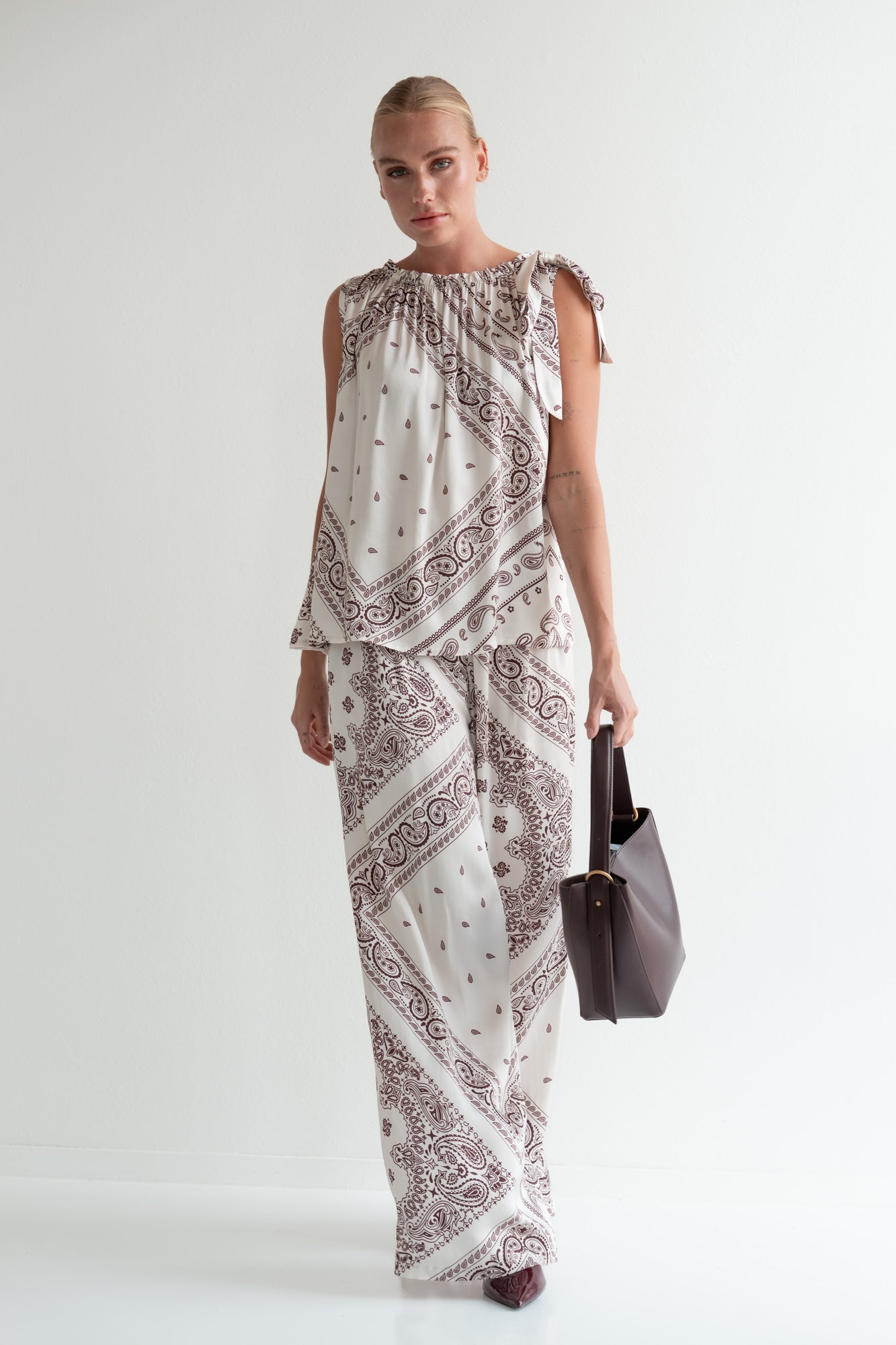 The Julia top is a light and feminine piece featuring a rich all-over print and refined details. Soft gathers at the neckline and a decorative tie add an elegant touch, while the fluid fabric drapes beautifully for a flattering silhouette. A true statement piece that remains easy to wear.
